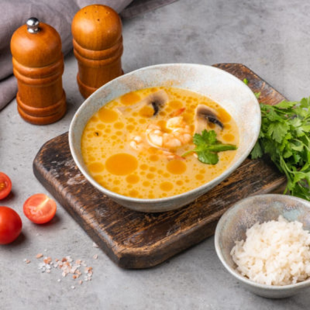 Бульон том ям, грибы, черри, морепродукты, рис, кинза