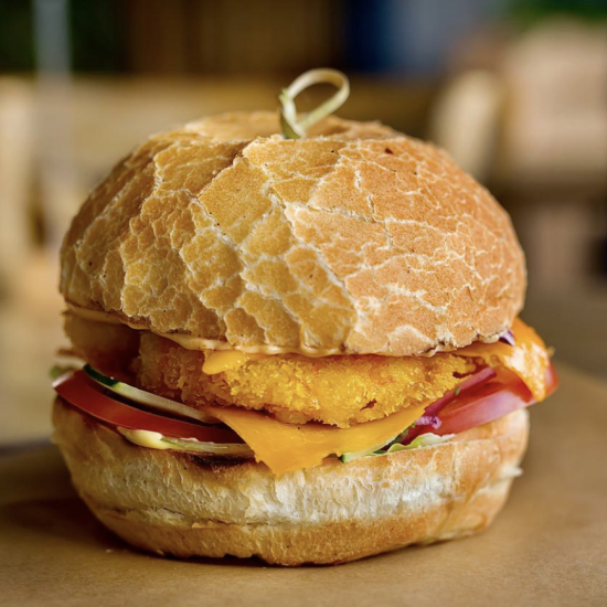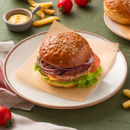 Булочка, кетчуп, горчица, майонез, котлета куриная, помидор, лук маринованный, огурец консервированный, сыр, капуста пекинская.