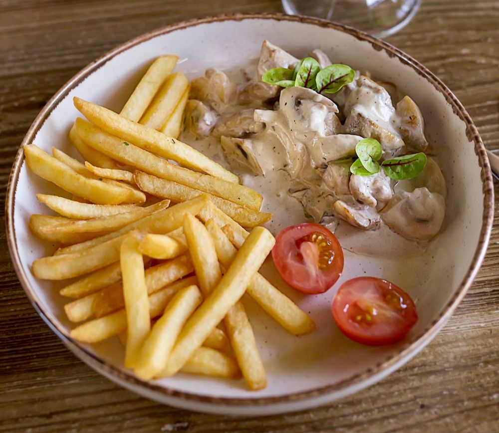 Картофель фри, соус дорблю, шампиньоны, филе бедра, помидор черри.