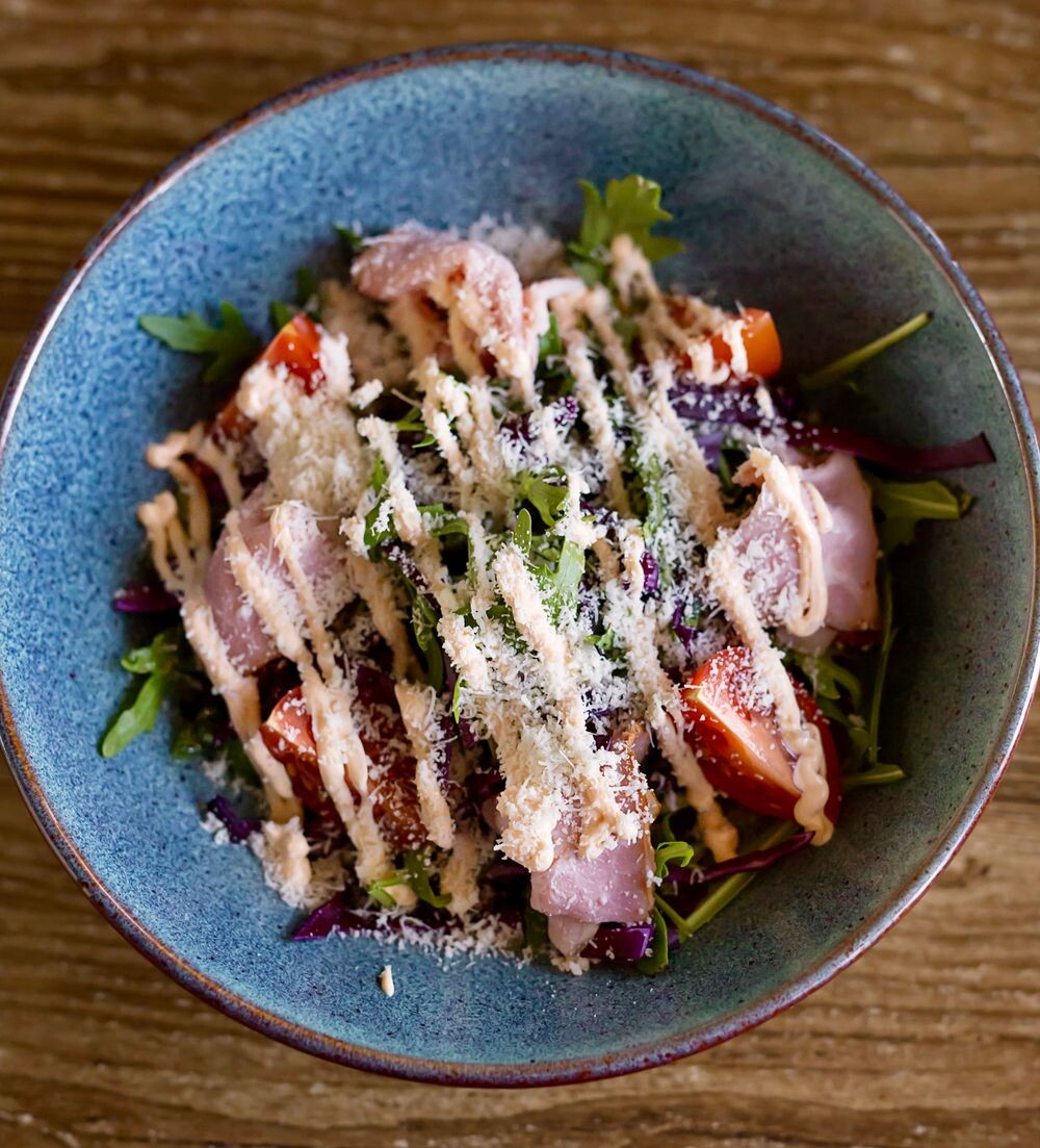 Окорок копченый, капуста красная, руккола, помидор черри, соевый соус, соус кимчи , масло оливковое, сыр пармезан.